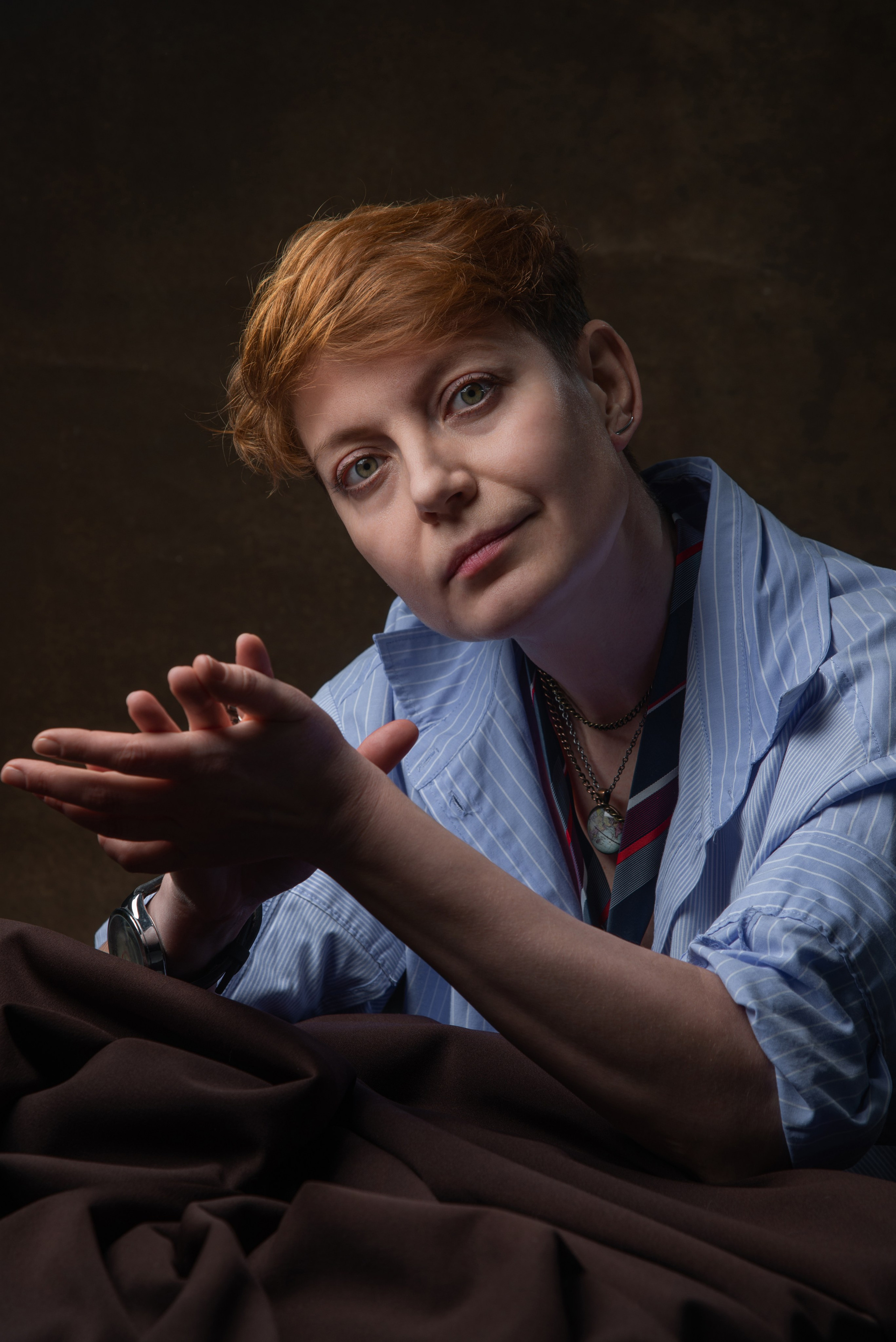 2. В студии. Вы приходите, и первые 10–15 минут мы просто пьём чай и разговариваем. Это не потеря времени, а важная часть процесса: вы расслабляетесь, привыкаете ко мне и пространству. Дальше съёмка идёт легче и естественнее.